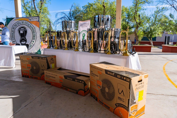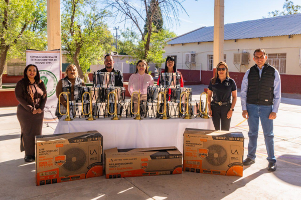 Gracias a las monedas depositadas en los parquímetros por parte de los meoquenses sumados a la Sociedad de Padres de Familia, el Consejo Municipal de Estacionómetros de Meoqui entregó un apoyo a la escuela primaria 5 de Febrero de la comunidad de Estación Consuelo, que comprende en 12 tambores, 12 trompetas y dos minisplits, con una inversión conjunta superior a los 57 mil pesos.