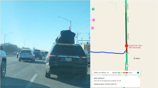 Esta tarde, el tráfico lento produjo una fila de cerca de 5 kilómetros y medio antes de llegar a la caseta Ahumada, en la carretera federal 45, en el sentido Ciudad Juárez - Chihuahua.