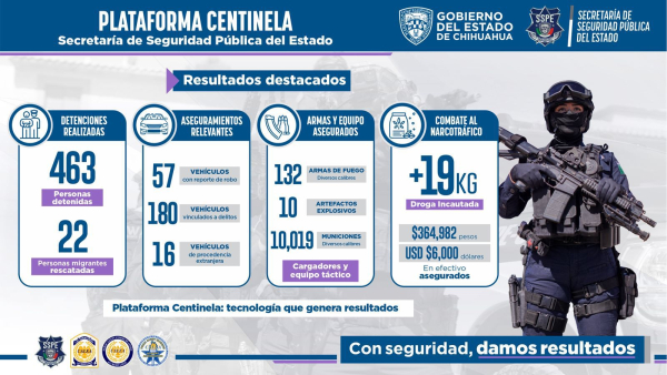 Estos resultados confirman que la Plataforma Centinela no es solo un proyecto tecnológico, sino una estrategia integral de seguridad impulsada por el Secretario de Seguridad Pública del Estado, Gilberto Loya Chávez, que continúa generando impactos positivos, medibles y sostenidos en favor de la seguridad ciudadana, porque con Seguridad damos resultados.