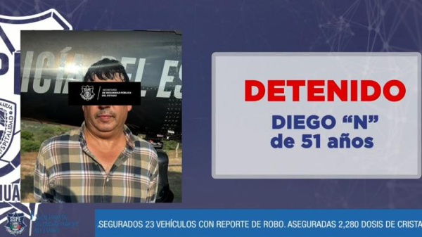 Diego C.P., de 51 años de edad, esposo de la exalcaldesa de Moris, Perla López, presuntamente fabricaba blindaje artesanal y modificaba vehículos robados para el crimen organizado. Fue detenido junto con otras ocho personas en Moris.