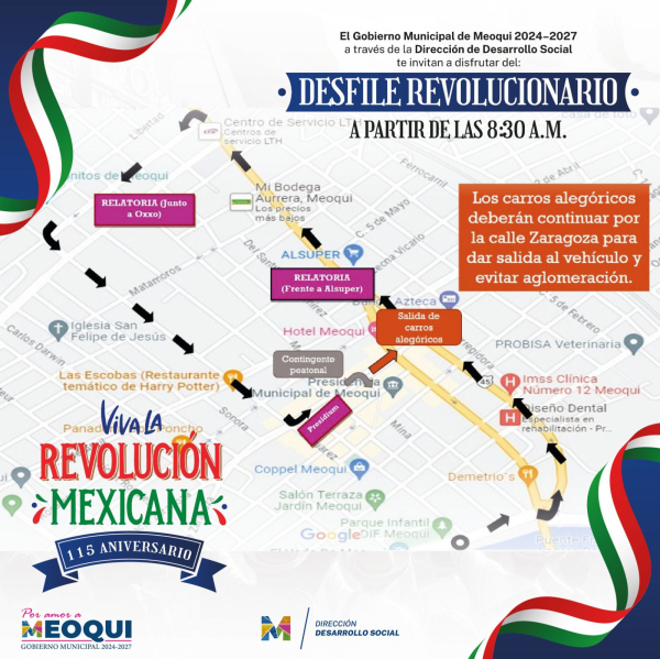 La alcaldesa de Meoqui, Miriam Soto, invitó a todas las familias del municipio a participar en el tradicional Desfile por el 115 Aniversario de la Revolución Mexicana, mismo que recorrerá las principales calles de la ciudad, concluyendo con una verbena en la explanada principal, con presentaciones culturales, Feria de Emprendedores, Toro Mecánico y música en vivo, recordando una de las celebraciones más importantes de la historia del país.
