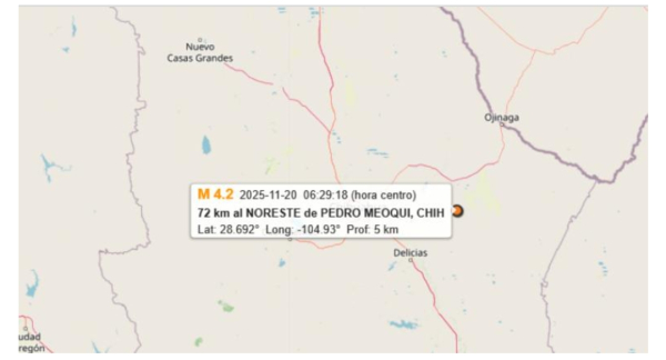 Fue a las 6:29:18 a.m., cuando se suscitó el sismo de magnitud 4.2 grados a 72 kilómetros al noroste de Pedro Meoqui, Chihuahua, en la latitud 28.692° y longitud -104.93°.