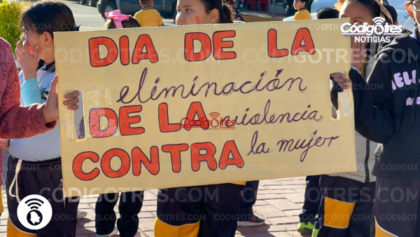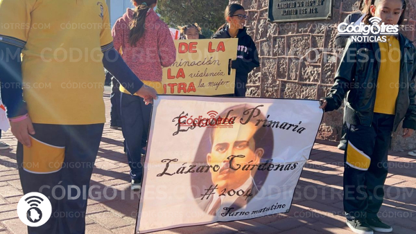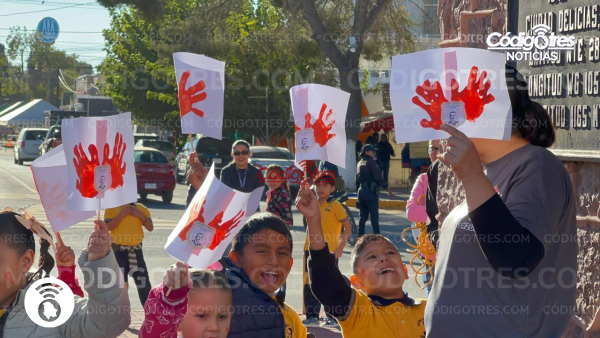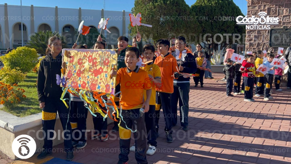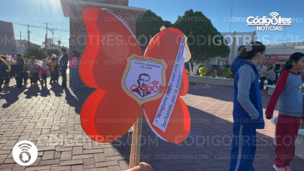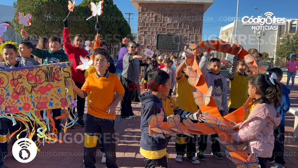 Delicias. – La directora de la primaria Lázaro Cárdenas 200, Melina Navarro, da a conocer que debido a que mañana es el Día Internacional de la Eliminación de la Violencia contra la Mujer decidieron desde hoy visibilizarlo con una caminata que partió de la escuela en la Av. Del Parque y se colocaron en el Reloj Publico, además de repartir mariposas monarcas que es el símbolo del día.