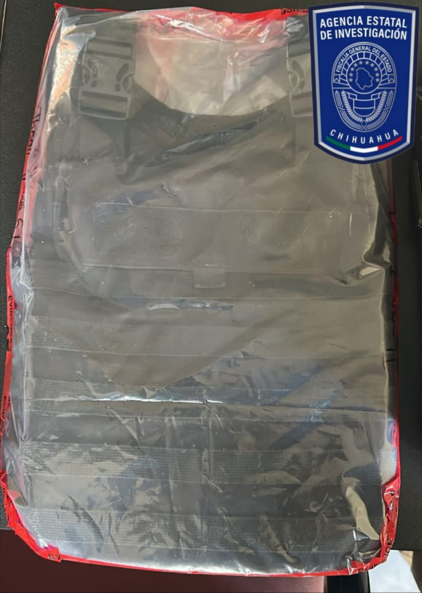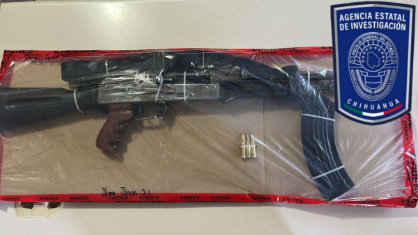 Asimismo, en la calle Pascual Orozco, Policías Investigadores aseguraron un fusil calibre 7.62x39, abastecido con tres cartuchos, así como un chaleco táctico de color negro.