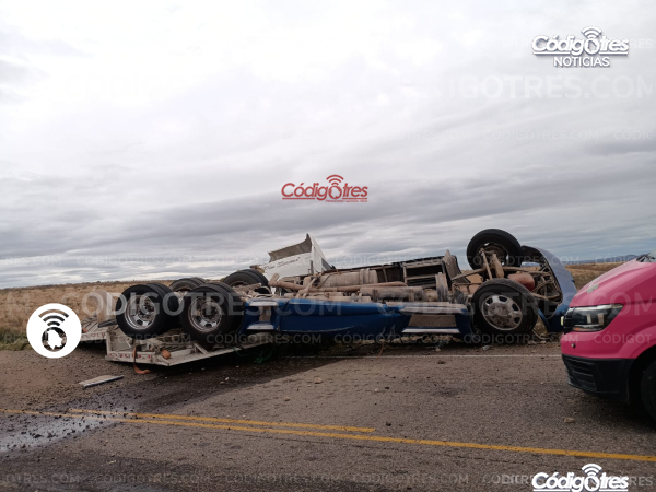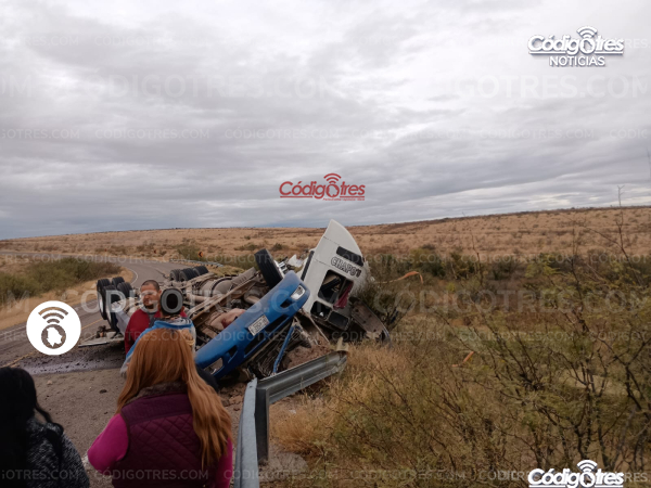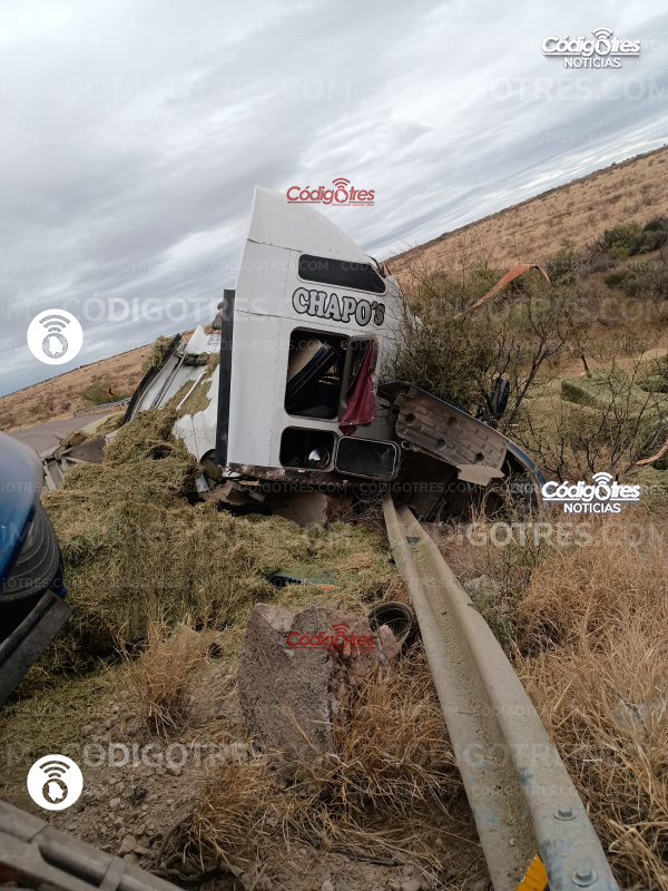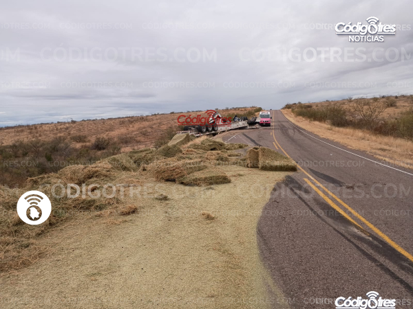 Un tráiler que trasportaba pacas de alfalfa sufrió un fuerte accidente vial en la carretera Delicias- Satevo km 12.