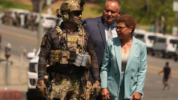 Aproximadamente a las 11.07 a.m., la alcaldesa Karen Bass llegó a bordo de un vehículo municipal y rápidamente fue rodeada por representantes de los medios locales y agentes federales.