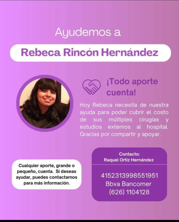 Rebeca solo tiene 20 años y el domingo tuvo un accidente en donde sufrió de varias lesiones, fracturas en pelvis, cadera, cara y piernas (incluyendo pérdida de hueso que requiere injerto), necesita múltiples cirugías y estudios especializados fuera del hospital.