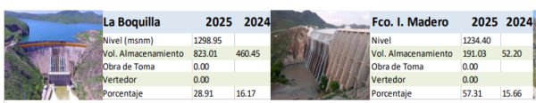 La recuperación es muy buena, en el estado ya hay 2 presas que están derramando, para que exista la posibilidad de un ciclo agrícola la Boquilla debe alcanzar un 35% y la Francisco I. Madero un 60%, según calcula Salvador Alcantar diputado federal suplente. Al día de hoy 04 de agosto la CONAGUA calcula que la primera está al 28.91% y la segunda al 57. 31%.