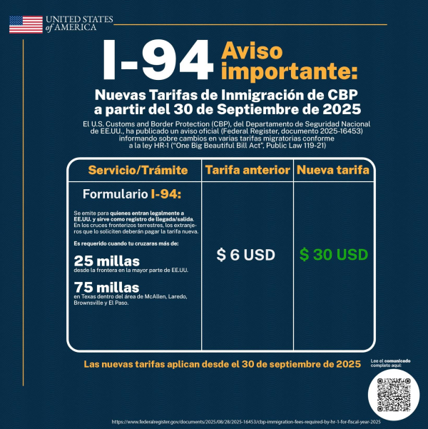 Ciudad Juárez.- El Servicio de Aduanas y Protección Fronteriza de Estados Unidos (CBP, por sus siglas en inglés) anunció un incremento significativo en la tarifa del formulario I-94, documento requerido para personas que ingresan por vía terrestre al país. A partir del 30 de septiembre de 2025, el costo pasará de seis a 30 dólares, según lo publicado en el Registro Federal bajo el documento número 2025-14543.