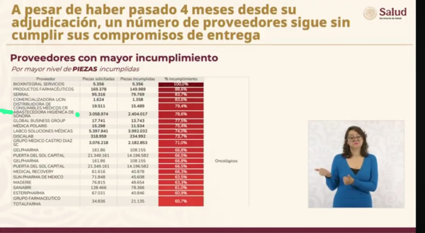 Durante la conferencia matutina, Eduardo Clark, subsecretario de Integración y Desarrollo del Sector Salud, presentó una lista de empresas —nacionales y extranjeras— que han fallado en sus compromisos contractuales. Entre ellas, destacó a Bioxintegral Servicios, que no ha entregado una sola pieza, y a Productos Farmacéuticos, que debe aún el 88.6% de lo solicitado.