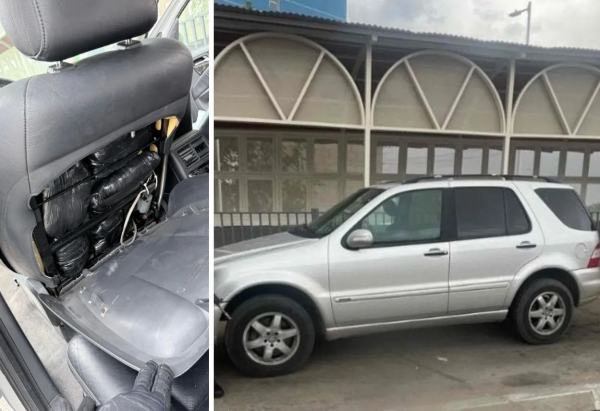 Al momento en que la unidad fue revisada por un binomio K9, localizaron los nueve paquetes de droga dentro del asiento del conductor, el cual tenía una tapa plástica en la parte trasera para cubrir el estupefaciente.