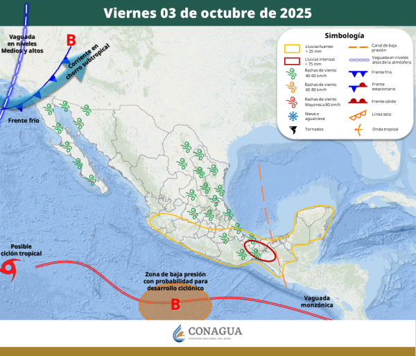 Según el mapa de sistemas del día viernes 3 de octubre, el Frente Frío -que será el número 5 si se confirma- entrará al noroeste de México, impulsando una corriente en chorro subtropical y una vaguada en niveles medios y altos.