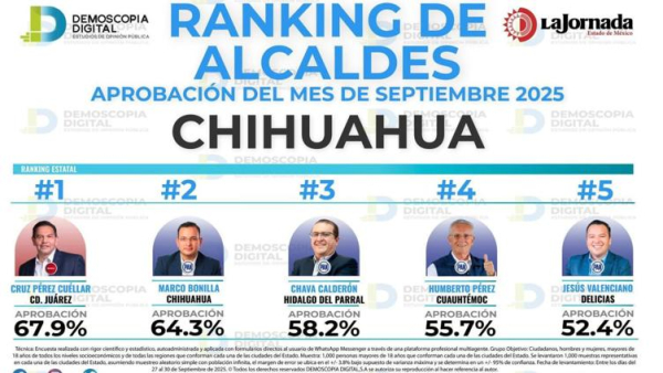 De acuerdo con la medición, Pérez Cuéllar registra un 67.9% de aprobación; Bonilla Mendoza, un 64.3%; Calderón Aguirre, un 58.2%. Además, en cuarto y quinto término se encuentran el presidente municipal de Cuauhtémoc, Humberto Pérez Mendoza, con un 55.7%, y Jesús Valenciano García, de Delicias.