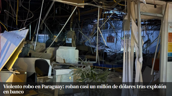 H. Cd de Chihuahua.- Un grupo de hombres armados robó cerca de 910 mil dólares de una sucursal del Banco Itaú en la ciudad de Katueté, departamento de Canindeyú, al este de Paraguay, en la frontera con Brasil. Según informaron autoridades policiales y de la fiscalía, los delincuentes irrumpieron de madrugada tras detonar explosivos de gran potencia que destruyeron la bóveda del banco.