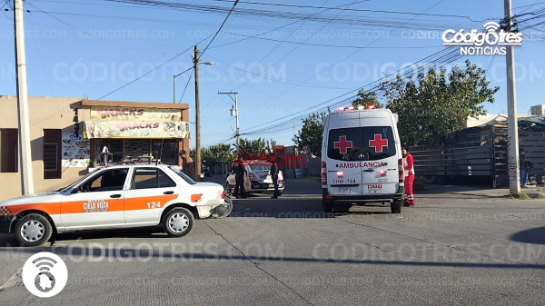 Delicias. – Un taxi y una motocicleta protagonizaron un choque en el fraccionamiento Las Torres, Av. 14 ½ oriente y C. 15 oriente.