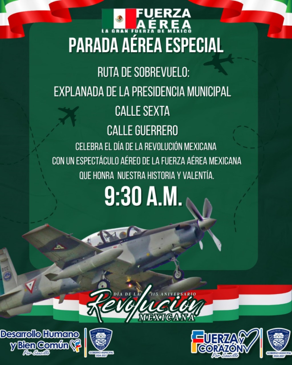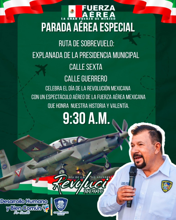Saucillo, Chih. — El alcalde Fito Gardea anunció que este 20 de noviembre el municipio conmemorará el Día de la Revolución Mexicana con un acto simbólico que incluirá una parada aérea a cargo de la Fuerza Aérea Mexicana. La actividad está programada para iniciar a las 9:30 horas, con un recorrido que abarcará la Explanada de la Presidencia Municipal, la calle Sexta y la calle Guerrero.