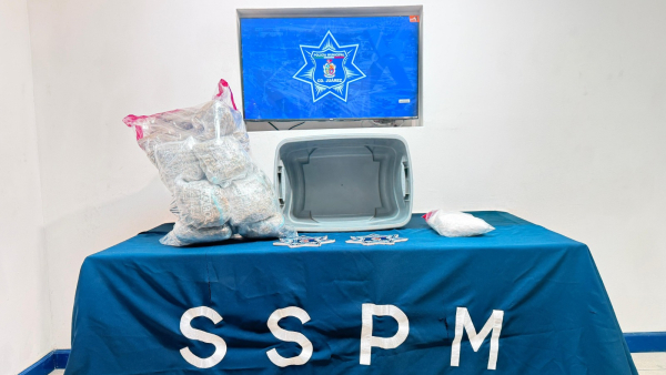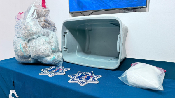 Metros adelante, ambas personas fueron interceptadas conforme a los protocolos de seguridad, en donde al revisar el contenedor abandonado, se localizaron 16 paquetes de marihuana, con un peso aproximado de siete kilogramos, así como dos bolsas de cristal, con un peso cercano a un kilo 478 gramos, siendo puestos bajo detención.