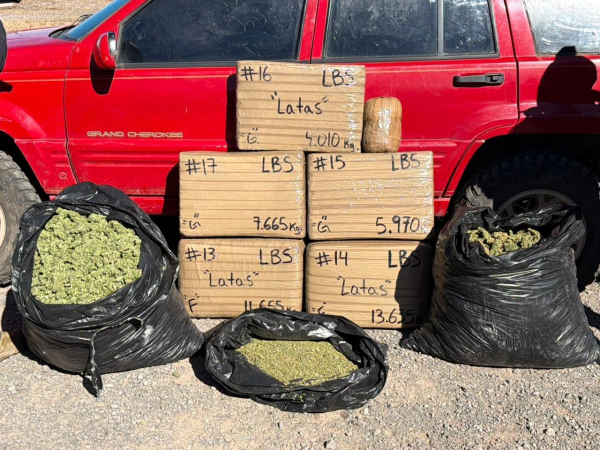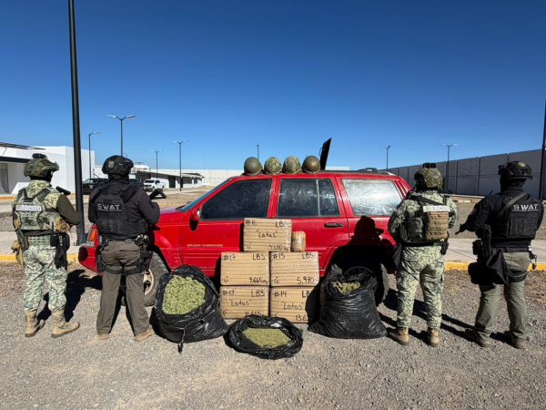 Durante la inspección se aseguraron varios paquetes envueltos en cinta canela con olor similar a la marihuana con un peso aproximado de 90 kilogramos, además de dos artefactos explosivos, uniformes tácticos y cuatro cascos balísticos.