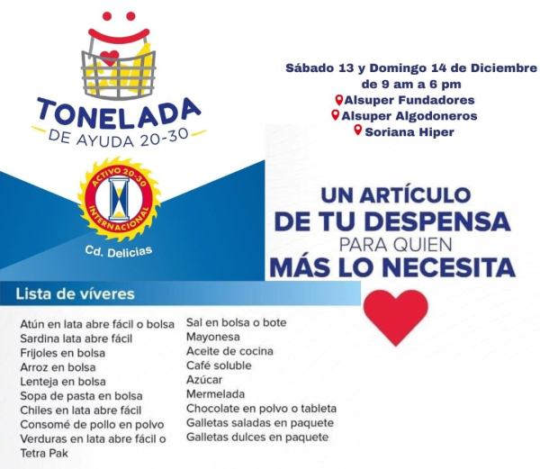 Delicias. – Este fin de semana el Activo 20-30 estará realizando una colecta de víveres no perecederos en beneficio a Caritas del Santuario.
