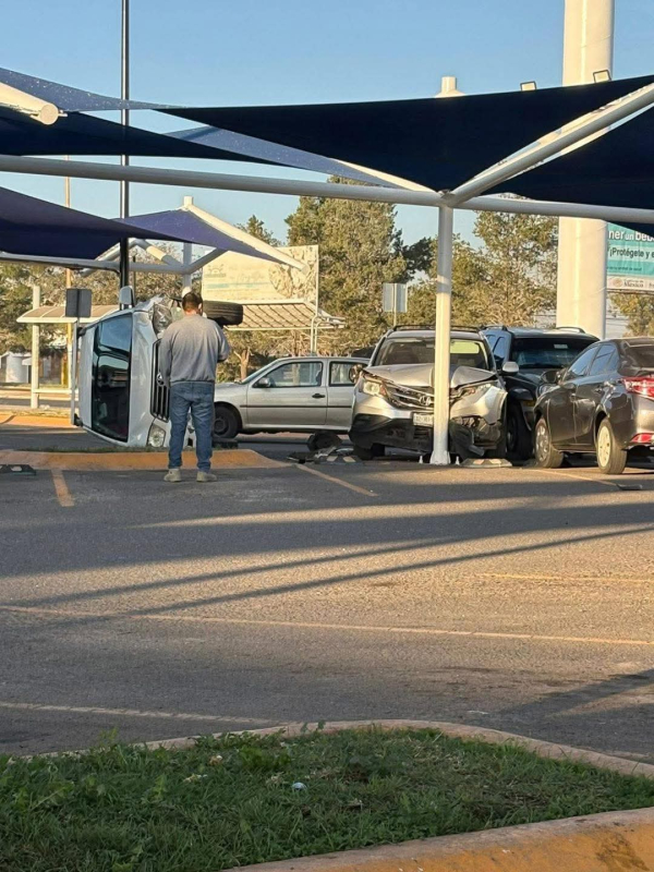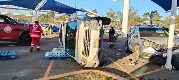 Durango.- La mañana de este miércoles, se registró un accidente inusual dentro del estacionamiento de Walmart Francisco Villa, donde un conductor impactó su camioneta contra otro vehículo y terminó volcado. 🚗💥