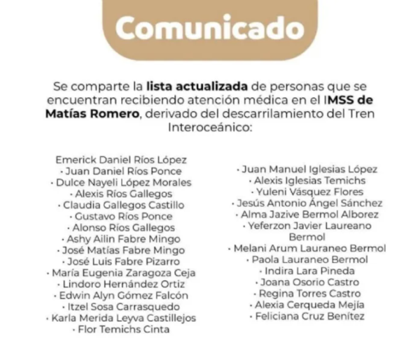 OAXACA.- El Instituto Mexicano del Seguro Social (IMSS) Bienestar publicó la lista oficial de personas identificadas que se encuentran hospitalizadas en cuatro de sus clínicas de Oaxaca tras el accidente del descarrilamiento del Tren Interoceánico que ha dejado alrededor de 97 heridos y 13 personas sin vida.