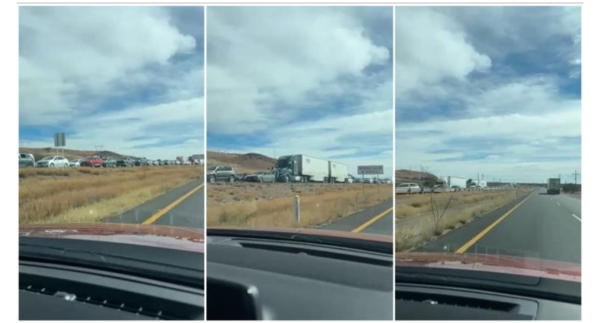 A través de redes sociales fue compartido un video en el que una copiloto captó la enorme fila de automóviles varados sobre la carretera Chihuahua–Delicias, evidenciando la magnitud del congestionamiento provocado por el tráiler que quedó atravesado en la vía.