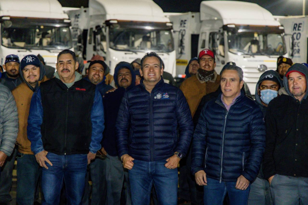 H. Ciudad de Chihuahua, Chih., a 6 de enero de 2026.- El alcalde Marco Bonilla hizo entrega al personal de limpieza de la Dirección de Servicios Públicos Municipales, 15 camiones nuevos para la recolección de basura habitacional, 13 pick ups medianas y tres con capacidad de 3.5 toneladas para la limpieza de calles y avenidas, como parte del compromiso adquirido el año pasado para mejorar el servicio de limpia de la ciudad.