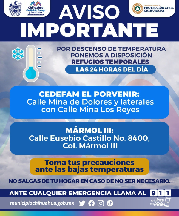 H. Ciudad de Chihuahua, Chih., a 8 de enero de 2026.- El Gobierno Municipal, a través del DIF y la Coordinación Municipal de Protección Civil, informa que, ante las bajas temperaturas donde pronostican mínimas de hasta -3°C para este fin de semana, del 9 al 11 de enero, se mantendrán habilitados las 24 horas los refugios temporales para resguardar a las personas que lo necesiten.
