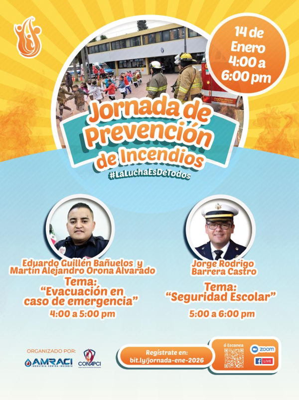 El tendrá una participación el próximo 14 de enero de 4:00 pm a 5:00 pm, con el tema ‘’evacuación en caso de emergencia’’. Destaca que es importante el sintonizar las diversas conferencias que imparten durante las Jornadas de Prevención de Incendios, ya que a nivel nacional diversos expertos exponen temas de inclusión, simulacros, actividades, capacitaciones, etc. La intención es que en conjunto puedan servir para evitar pérdidas humanas y accidentes.