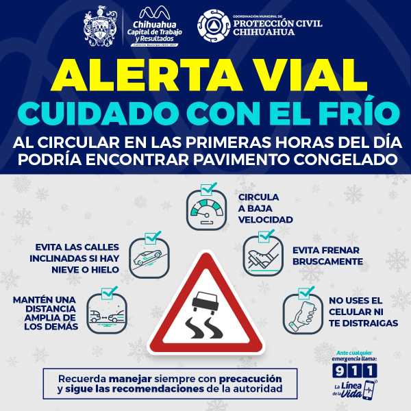 El Gobierno Municipal de Chihuahua a través de la Coordinación Municipal de Protección Civil, informa que para el día lunes por la mañana existe la probabilidad de precipitaciones de nieve o aguanieve, por lo que exhorta a la ciudadanía a conducir con precaución ante un congelamiento del pavimento.