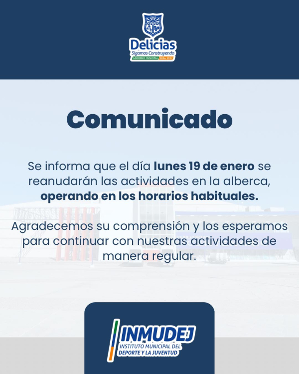 El lunes 19 de enero se tiene prevista la apertura a las 6 am, momento en que se retomarán clases de natación, clases para adultos, clases para equipos selectivos y este año implementarán junto con la nueva coordinadora La Mtra. Alma Murillo clases de aquaeróbics a las 10 u 11 am para que las personas adultas tengan oportunidad de hacer ejercicio en el agua.