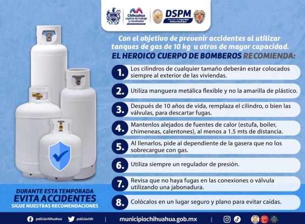 H. Ciudad de Chihuahua, Chih., a 14 de enero de 2026.- Ante el descenso de las temperaturas registrado en la capital, el H. Cuerpo de Bomberos emite recomendaciones al momento de manejar tanques de gas, ya que pueden derivar en fallas principalmente por un llenado inadecuado y falta de revisión preventiva.