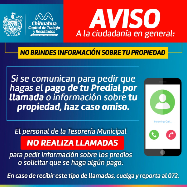 H. Ciudad de Chihuahua, Chih., a 21 de enero del 2026.- El Gobierno Municipal, a través de la Tesorería Municipal, exhorta a la población en general a no brindar información de sus propiedades a través de llamadas telefónicas; asimismo se informa que las y los empleados de la institución no realizan llamadas a las y los contribuyentes para pedir información sobre su propiedad o para que realicen algún pago del Predial.