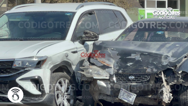 Delicias. – Dos automóviles se impactaron en la Av. Calzada del Charro y Av. 6ta oriente, frente a la plaza comercial Delfines, lo que ocasionó bastante trafico en el área al ser hora altamente concurrida.