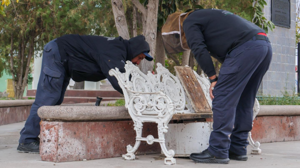 Meoqui. – Esta mañana Bomberos de Meoqui atendió un llamado en el seccional de Guadalupe Victoria en donde unas abejas crearon su panal en una banca.