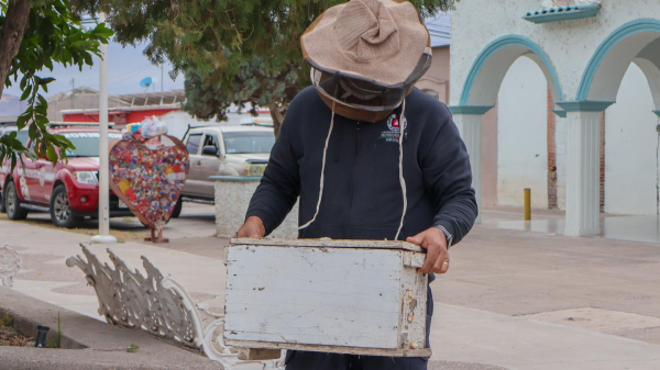 Rodolfo Gutiérrez, coordinación de Protección Civil y Bomberos de Meoqui, informa que gracias a que desde 8 años procurar seguir estrictos protocolos de actuación en estos casos para preservar las abejas, con cuidado retiraron el panal de la banca y lo llevaron a un apiario para que puedan seguir su vida y creen miel.