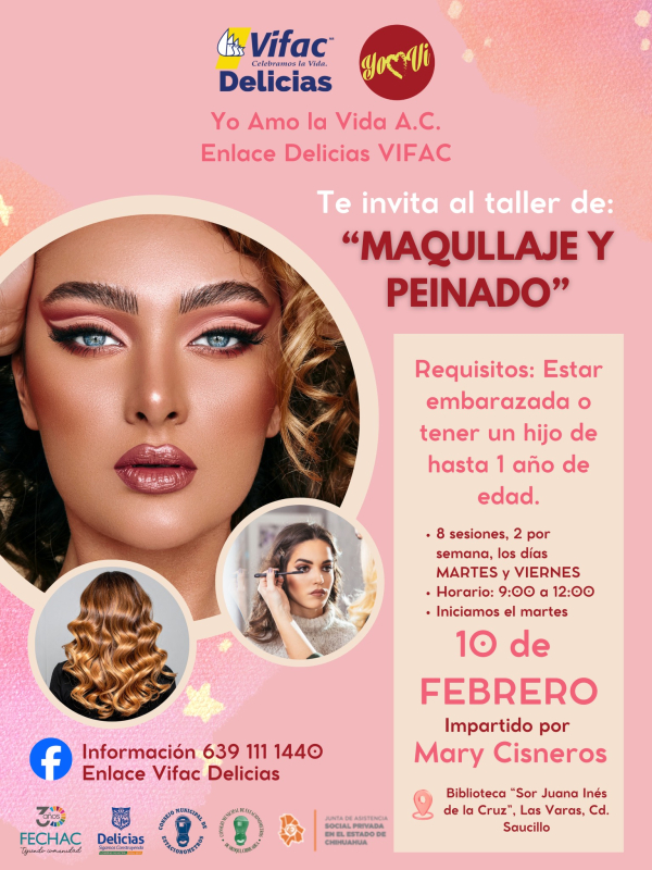 Oliva Miramontes, directora de la asociación Yo Amo la Vida Enlace Vifac Delicias, informa que el taller de maquillaje y peinado, se realizará en un horario de 9 am a 12 pm los martes y viernes en la Biblioteca ‘’Sor Juana Inés de la Cruz’’. Siendo en total 8 sesiones impartidas por Mary Cisneros. El cupo mínimo es de 10 personas y máximo 20.