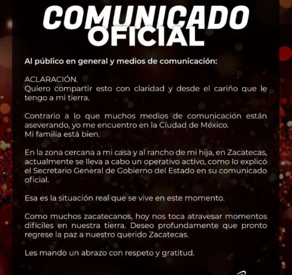 “En la zona cercana a mi casa y al rancho de mi hija, en Zacatecas, actualmente se lleva a cabo un operativo activo, como lo explicó el secretario General de Gobierno del Estado en su comunicado oficial”, explicó.