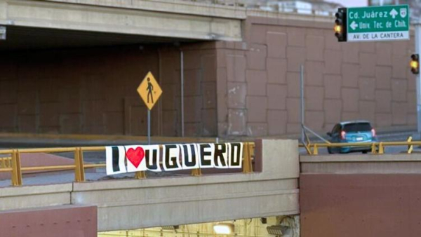 El día de San Valentín comenzó con una muestra de cariño, un mensaje colocado en periférico De la Juventud y avenida La Cantera de una joven para su novio, uno de los cruces más importantes de la ciudad de Chihuahua.