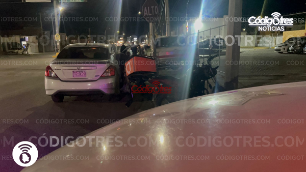 Un accidente vial se registró en el cruce de la avenida Río San Pedro y avenida Manzanos, donde se vieron involucrados una motocicleta color rojo y un vehículo Nissan Versa color gris.