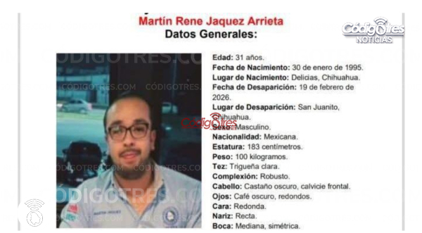 Un hombre identificado como Martín René Jáquez Arrieta, de 31 años y con domicilio en Delicias, fue encontrado sin vida en una brecha ubicada en la zona serrana del estado, después de que se emitiera un reporte por su desaparición el pasado 19 de febrero.