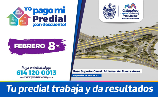 H. Ciudad de Chihuahua, Chih., a 23 de febrero de 2026.- El Gobierno Municipal, a través de la Tesorería, invita a aprovechar el 8 por ciento de descuento en el pago del impuesto Predial que finaliza este viernes 27 de febrero.