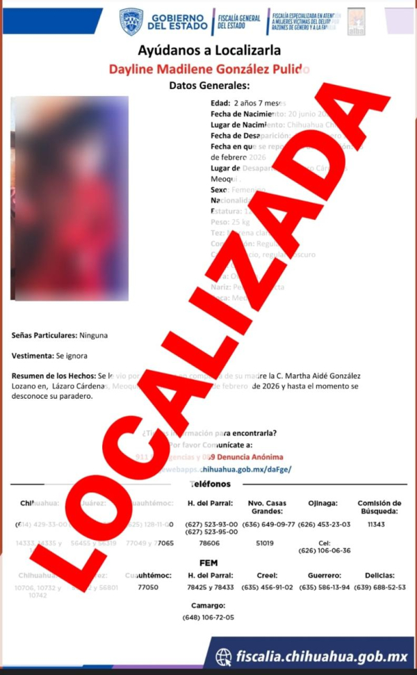 Fue en una colaboración ministerial entre autoridades de la FEM en Chihuahua y Meoqui que se logró dar con el paradero de madre e hija, quienes fueron localizadas en la colonia Lázaro Cárdenas en dicho municipio.
