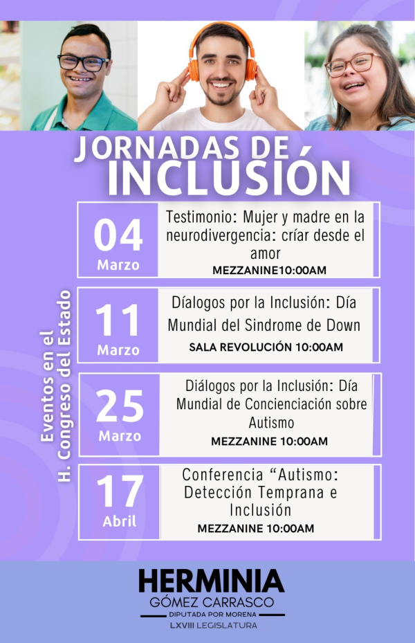 Las actividades iniciarán el 4 de marzo con un testimonio inaugural en el Mezzanine del Congreso. El 11 de marzo se llevará a cabo el encuentro “Diálogos por la Inclusión”, con la participación de jóvenes con síndrome de Down, en la Sala Revolución. El 25 de marzo se realizará una jornada similar enfocada en autismo, con la participación de jóvenes neurodivergentes, familiares y aliados.