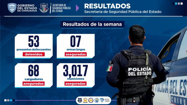 Asimismo, del 23 de febrero al 1 de marzo, como parte de las acciones policiales en el resto del estado, se registraron 53 detenciones —cinco por delitos del fuero federal y 48 por delitos del fuero común—, el aseguramiento de siete armas de fuego, 3 mil 17 municiones, 68 cargadores, un explosivo y más de 14 mil 790 dosis de diversas drogas como cocaína, cristal y marihuana.