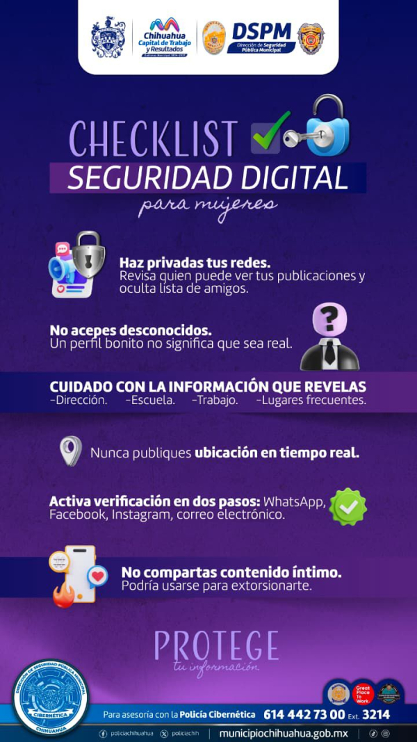 La Dirección de Seguridad Pública Municipal (DSPM), a través de la Policía Cibernética, hace un llamado a las mujeres para reforzar su seguridad en redes sociales y evitar ser víctimas de delitos digitales como la sextorsión y la extorsión.