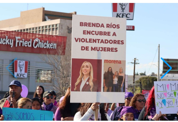 A lo largo del recorrido, varias participantes cargaron cartulinas que mostraban la fotografía de la funcionaria con la leyenda explícita: "Brenda Ríos encubre violentadores de mujeres".