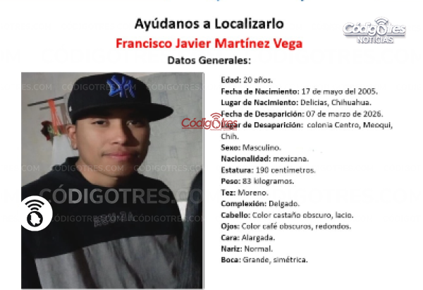 Delicias. - Desde el pasado sábado 7 de marzo se busca a Francisco Javier Martínez Vega, joven deliciense de 20 años que desapreció en el centro de Meoqui, por lo que su familia se encuentra desesperada al no saber de él.