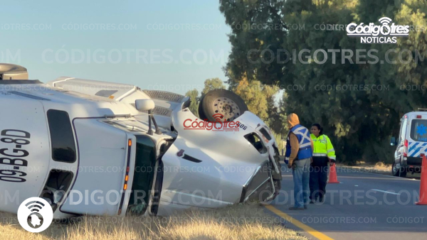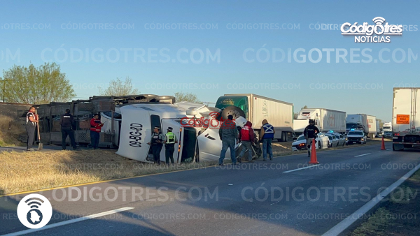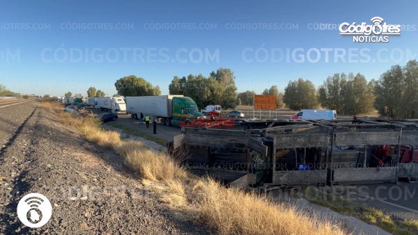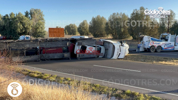 Una aparatosa volcadura de un tráiler tipo madrina, utilizado para el transporte de vehículos nuevos, generó un fuerte despliegue de autoridades y largas filas de automovilistas la mañana de este viernes en la carretera federal número 45, antes de llegar a la caseta de peaje de Saucillo.