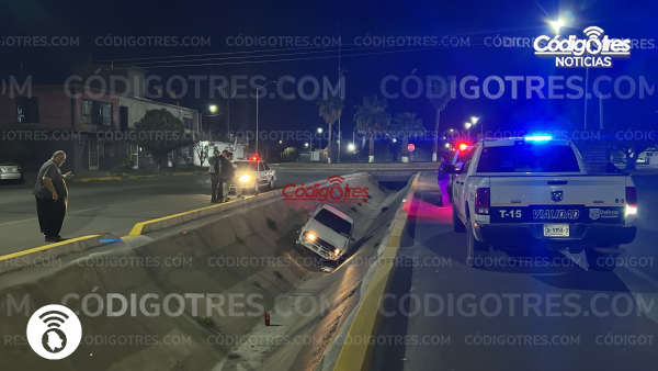 El hecho ocurrió sobre la avenida Río San Pedro, a la altura de la glorieta Gómez Morín, donde una pick up de color gris terminó dentro del canal tras perder el control.